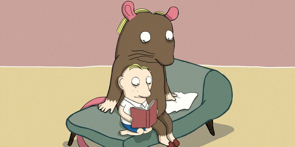 One of the most delightful shorts in the program is On the Mat Outside My Door. Rhymed couplets express the irritation caused by an uninvited rat guest. Based on a book by Nadia Budde, this short humorously advocates for sharing space and time with others.”
