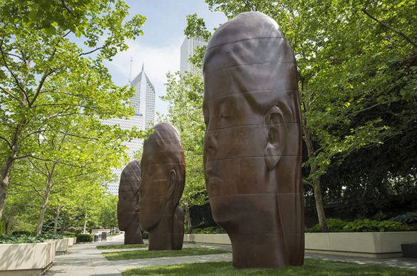 All Chicagoans know that on a hot summer day Millennium Park’s Crown Fountain will be covered with children playing in Jaume Plensa’s aquatic monumental sculpture. To celebrate the 10th anniversary of this beloved attraction, Plensa has created a special exhibition entitled 1004 Portraits, adding onto the 1,000 LED portraits of Chicago residents that light up the Crown Fountain. When entering Millennium Park, it’s hard to miss the 39-foot-tall head growing from out of the ground at the Michigan Avenue and Madison Street entrance. The other three heads, portraits of young girls made from cast iron and resin, are situated near the Crown Fountain in the South Boeing Gallery and are smaller in scale.