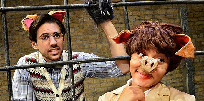 Photo: The pigs of Piggsylvania (foreground, L to R: Amanda Roeder, Diana Coates, and Allison Cain) conspire against Alexander T. Wolf, a.k.a. “The Big, Bad, Wolf” (background: David Sajewich), in Lifeline Theatre’s musical adaptation of “The True Story of the 3 Little Pigs!,” script and lyrics by Robert Kauzlaric, music by Paul Gilvary and William Rush, and directed by Amanda Link; based on popular children’s book by Jon Scieszka and Lane Smith. Photo by Suzanne Plunkett.