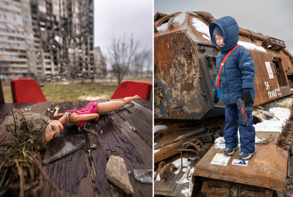 War takes a heavy toll on civilians. (Left) A Barbie doll in front of an apartment complex on the outskirts of Kharkiv. (Right) A young boy stands on a destroyed Russian tank in Kyiv.