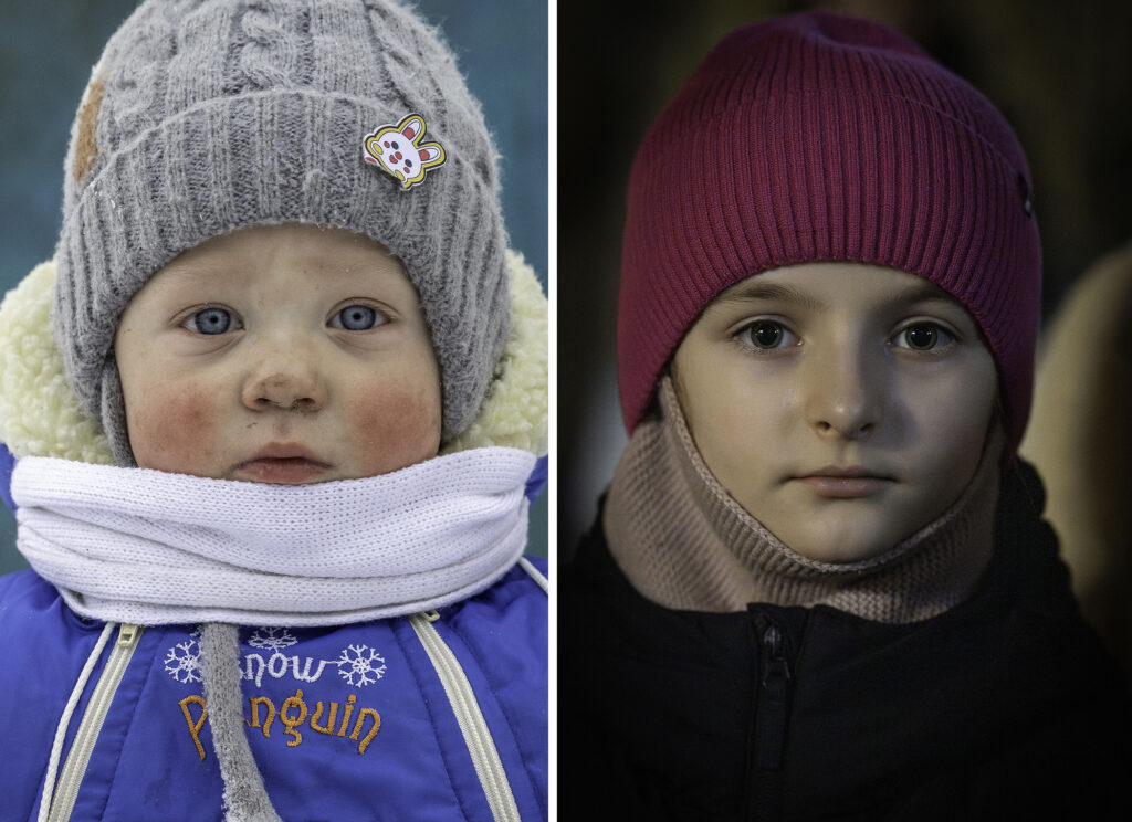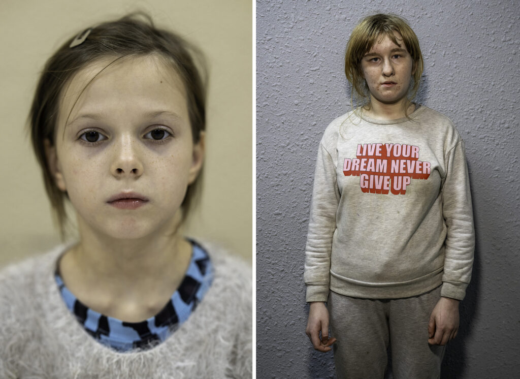 (Left) A child living a few miles from the line of contact in the Russo-Ukrainian War whose parents have refused to evacuate their village of Bunchuzhne. Missiles and drones are a constant threat in this zone. (Right) A young girl in a Kyiv church.