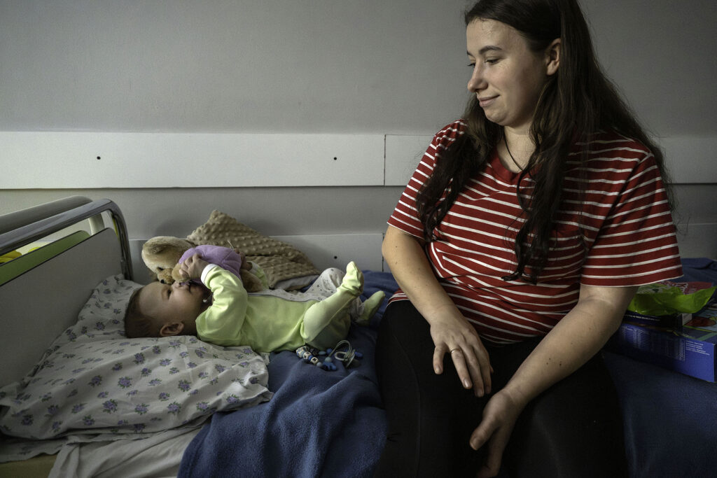 A mother with her child that’s being treated at the Center of Cardiology and Cardiac Surgery in Kyiv. Hospital resources have been strained due to the ongoing Russo-Ukrainian War as well as frequent power outages due to drone and missile attacks on the city’s infrastructure.