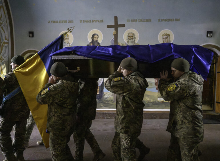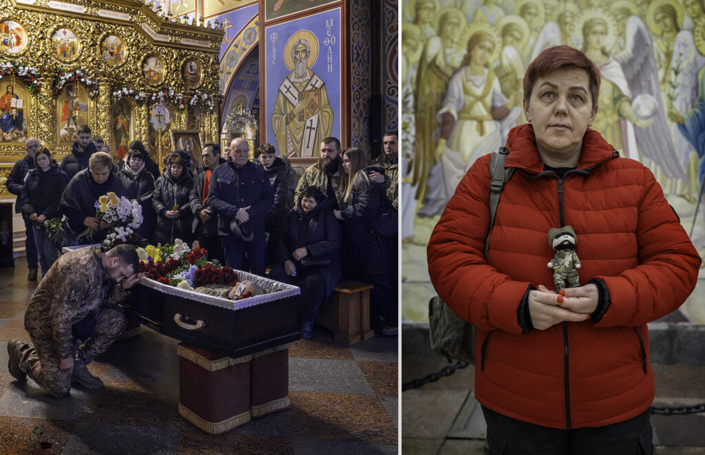 (Left) Funeral in St. Michael’s Golden-Domed Monastery in Kyiv for Ukrainian soldier Serhiy “Babaiy” Leondovich Motuziuk who was killed in action in the war against Russia. (Right) A mother at the St. Michael’s Golden-Domed Monastery in Kyiv holds an effigy of her son who was killed in the Russo-Ukrainian War.