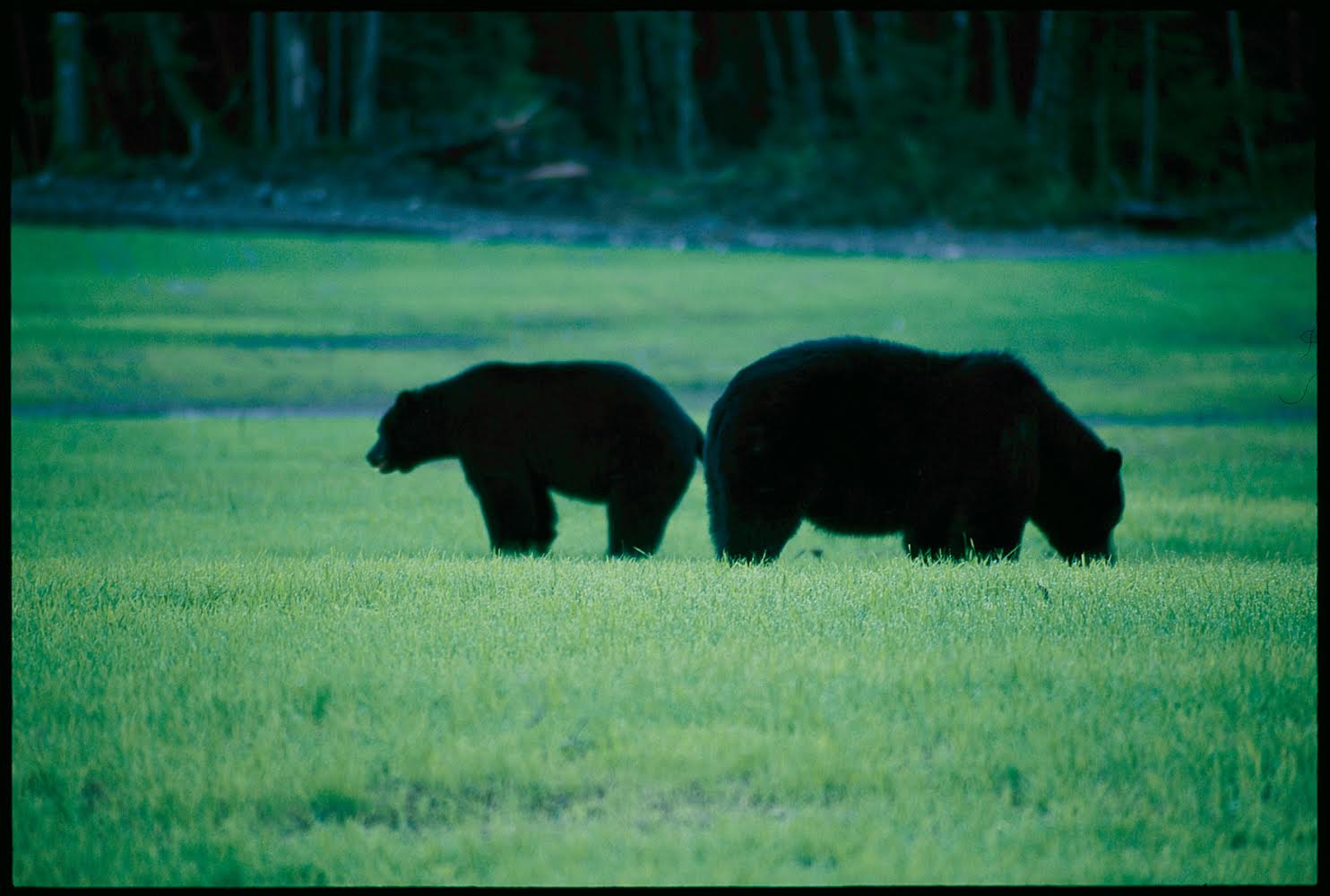 But in late summer and early autumn, the bears put on a show of their own. Often, in the early morning and sometimes again around dinner time, a half-dozen or so bear first visit the hay field up-river by the barn – where they snack on tender young hay shoots before making their way down river to the estuary for a main course of spawning salmon.