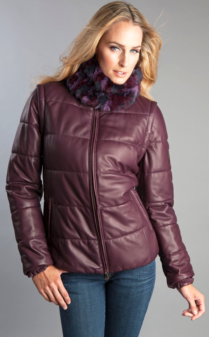 1. Plum dyed Lamb Leather Zip-up Jacket with Detachable Sleeves to transform into a sporty vest. $1495.00