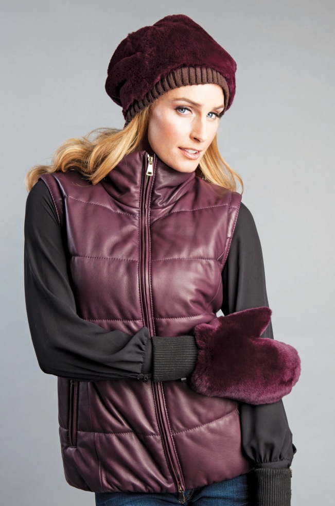 Bordeaux dyed Rex Rabbit “Marshmallow” Hat $395.00 and Matching Rex Rabbit Mittens with Leather and Knit Trim $259.00